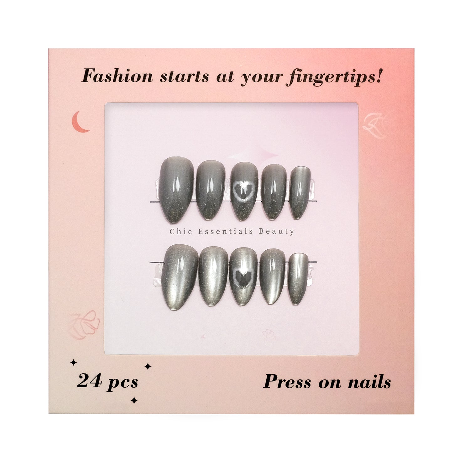 A sleek metallic grey finish with subtle heart accents, this set combines elegance with a modern twist. The reflective surface adds a touch of sophistication, making these nails perfect for evening events or when you want to stand out with a chic and edgy look.